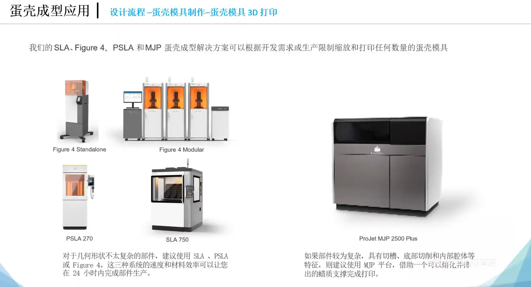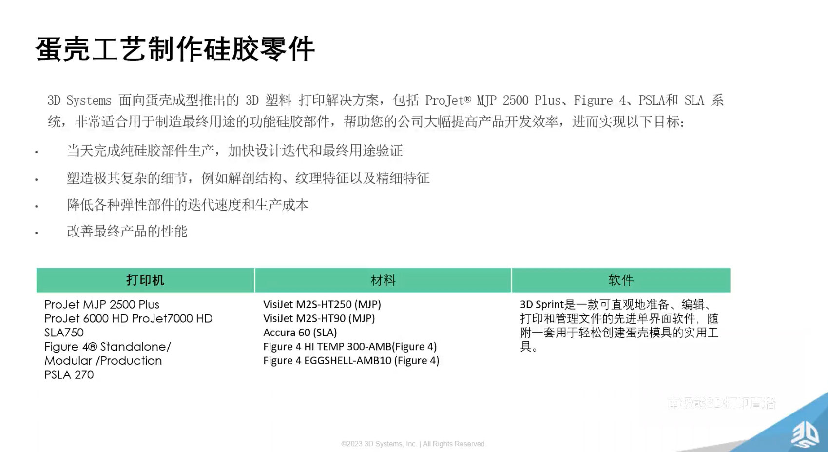 3D Systems 公司資深工程師丁超具體介紹了面向蛋殼成型推出的3D塑料打印解決方案,包括ProJet@MP2500Plus、Figure 4、PSLA和 SLA 系統(tǒng),非常適合用于制造最終用途的功能硅膠部件,幫助您的公司大幅提高產(chǎn)品開(kāi)發(fā)效率,進(jìn)而實(shí)現(xiàn)以下目標(biāo):