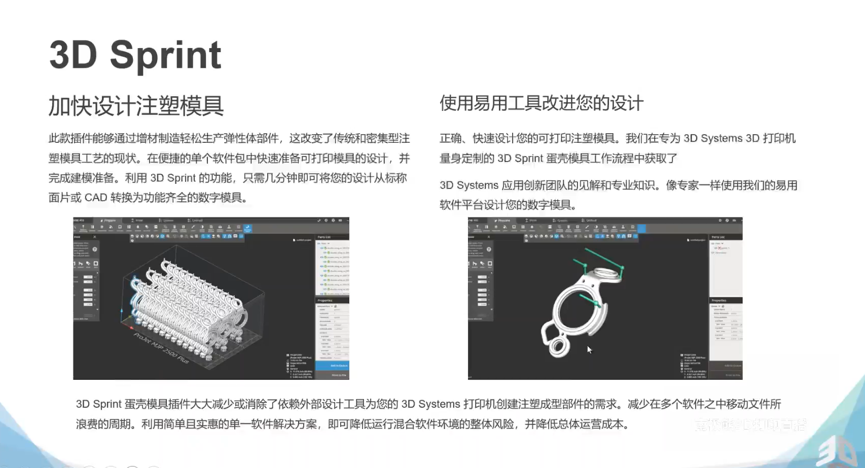 3D Sprint 蛋殼模具插件大大減少或消除了依賴外部設(shè)計(jì)工具為您的 3D Systems 打印機(jī)創(chuàng)建注塑成型部件的需求。減少在多個(gè)軟件之中移動(dòng)文件所浪費(fèi)的周期。利用簡(jiǎn)單且實(shí)惠的單一軟件解決方案,即可降低運(yùn)行混合軟件環(huán)境的整體風(fēng)險(xiǎn),并降低總體運(yùn)營(yíng)成本。