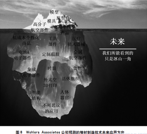 對(duì)于不同的應(yīng)用領(lǐng)域來(lái)說(shuō),短期內(nèi)增材制造技術(shù)還不足以代替?zhèn)鹘y(tǒng)的制造方式。但隨著打印材料價(jià)格的下降,打印尺寸和速度的提升,增材制造技術(shù)在各應(yīng)用領(lǐng)域的滲透也將逐步加深,人們會(huì)越來(lái)越多地使用到包含3D打印的零部件產(chǎn)品,甚至是完全通過(guò)3D打印制造的產(chǎn)品。如《Wohlers Report 2013》報(bào)告展示的遠(yuǎn)景一樣(圖8),我們所能看到的往往只是整個(gè)冰山的一小部分,而海面下隱藏的巨大冰山才是尚待開(kāi)發(fā)的領(lǐng)域,也是增材制造未來(lái)的潛力所 在。雖然我們還無(wú)法清晰的描述未來(lái)增材制造的全貌,但足以預(yù)期其技術(shù)發(fā)展趨勢(shì)。