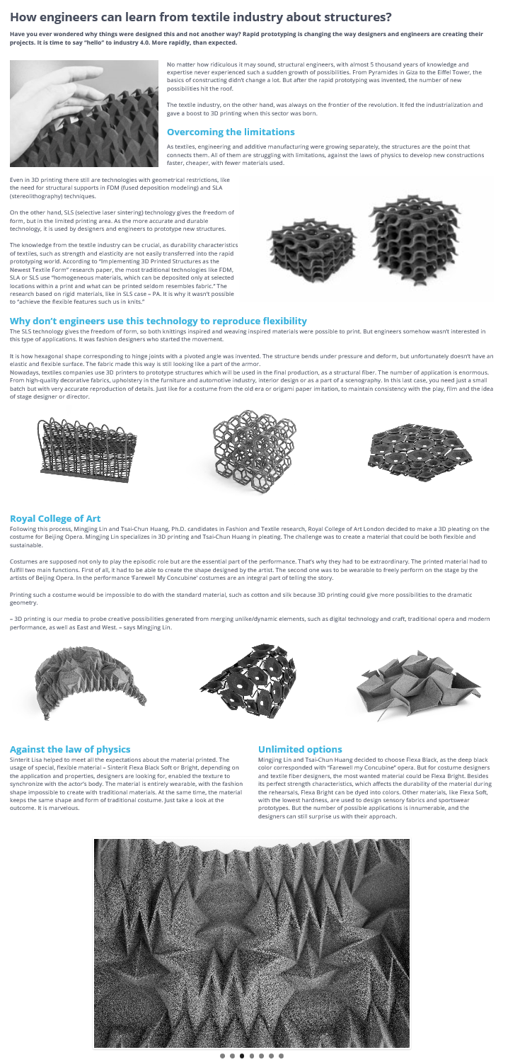 Sinterit Lisa幫助滿足了對印刷材料的所有期望。使用特殊的,柔韌的材料-Sinterit Flexa黑色柔軟或明亮,取決于應(yīng)用和性質(zhì),設(shè)計師正在尋找,使紋理與演員的身體同步。這種材料完全可穿戴,傳統(tǒng)材料無法創(chuàng)造出時尚的外形。同時,這種材料保持了傳統(tǒng)服裝的形狀和形式??纯唇Y(jié)果就知道了,太棒了。