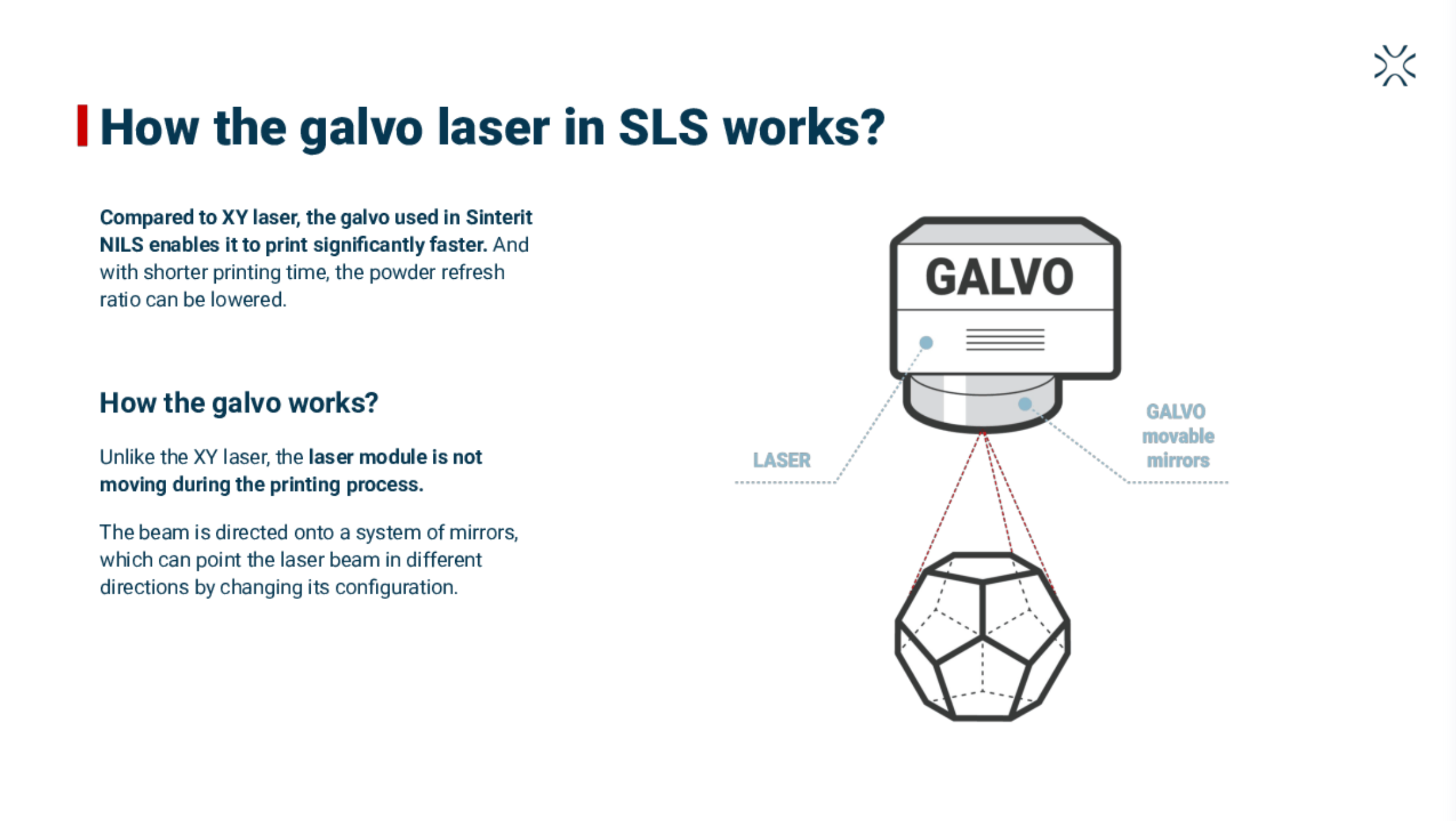 該設(shè)備最大的亮點(diǎn)是激光器由原來的XY激光更新為GALVO(振鏡)激光器,激光功率由原來的5W提升到30w,打印速度也提升到10-14mm/Hr,打印時間縮短從而降低了粉末的刷新率。大部分打印都可以在24Hrs內(nèi)完成,滿倉打印也幾乎不超過30Hrs。