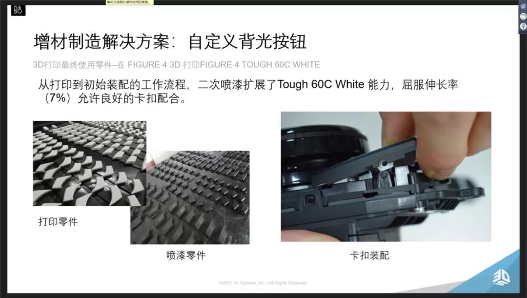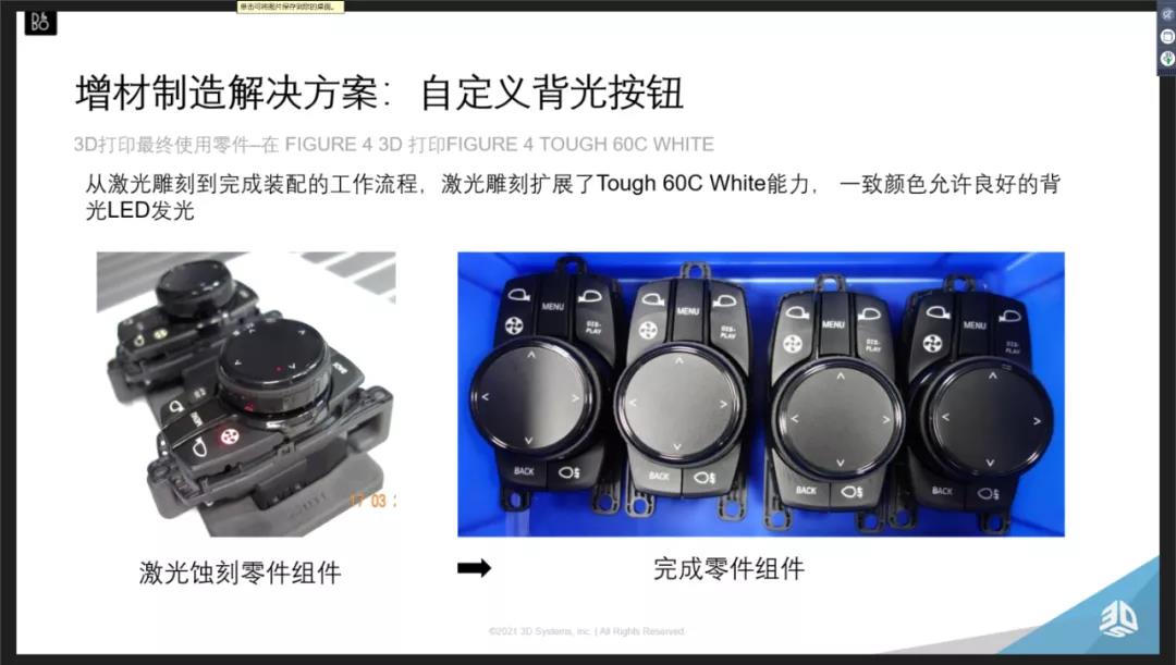 第二個案例是一個車內(nèi)的背光按鈕,需要滿足零件裝配的準確性和可重復性,零件必須能夠噴漆和激光蝕刻,具有背光LED發(fā)光能力,圖標在晚上可見,部件按鈕有手動重復按壓動作以及承受卡扣配合的能力。