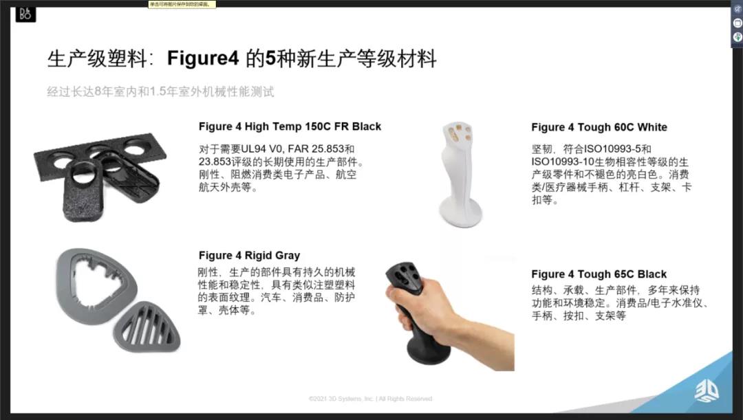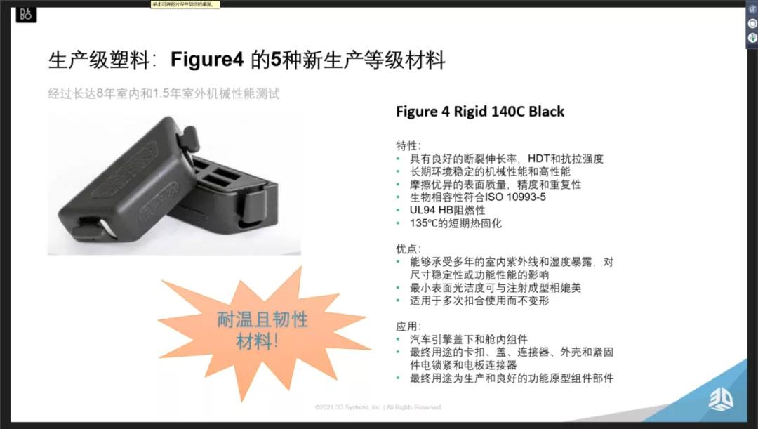 目前Figure 4能夠使用的5種新生產(chǎn)等級材料包括 High Temp 150C FR Black、Tough 60C White、Rigid Gray、Tough 65C Black、Rigid 140C Black。它們的特性如圖中所描述。
