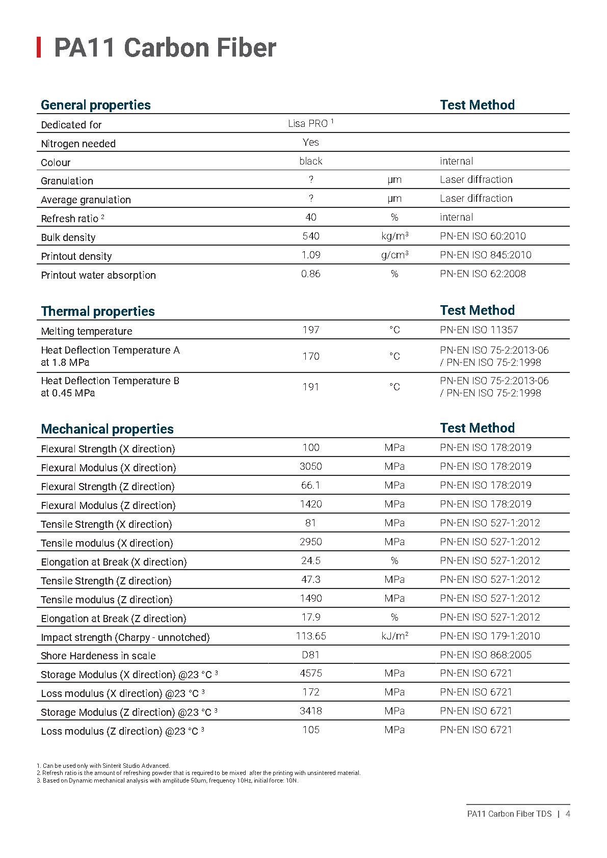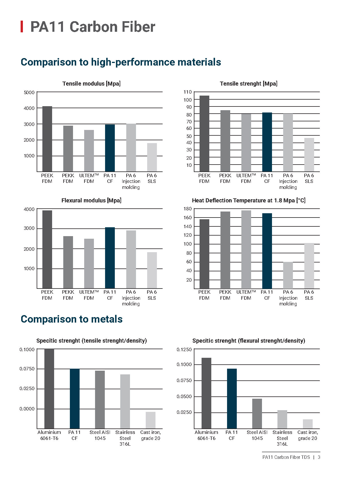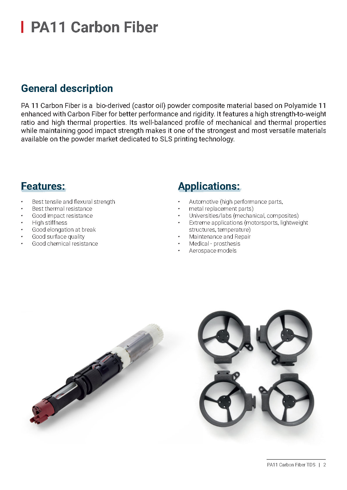?PA11碳纖維是一種生物衍生(蓖麻油)粉末復(fù)合材料,以PA11為基礎(chǔ),通過碳纖維增強,以獲得更好的性能和剛性。它具有高強度重量比和高熱性能。其良好的機械和熱性能平衡,同時保持良好的沖擊強度,使其成為粉末市場上用于SLS打印技術(shù)的最強和最通用的材料之一。